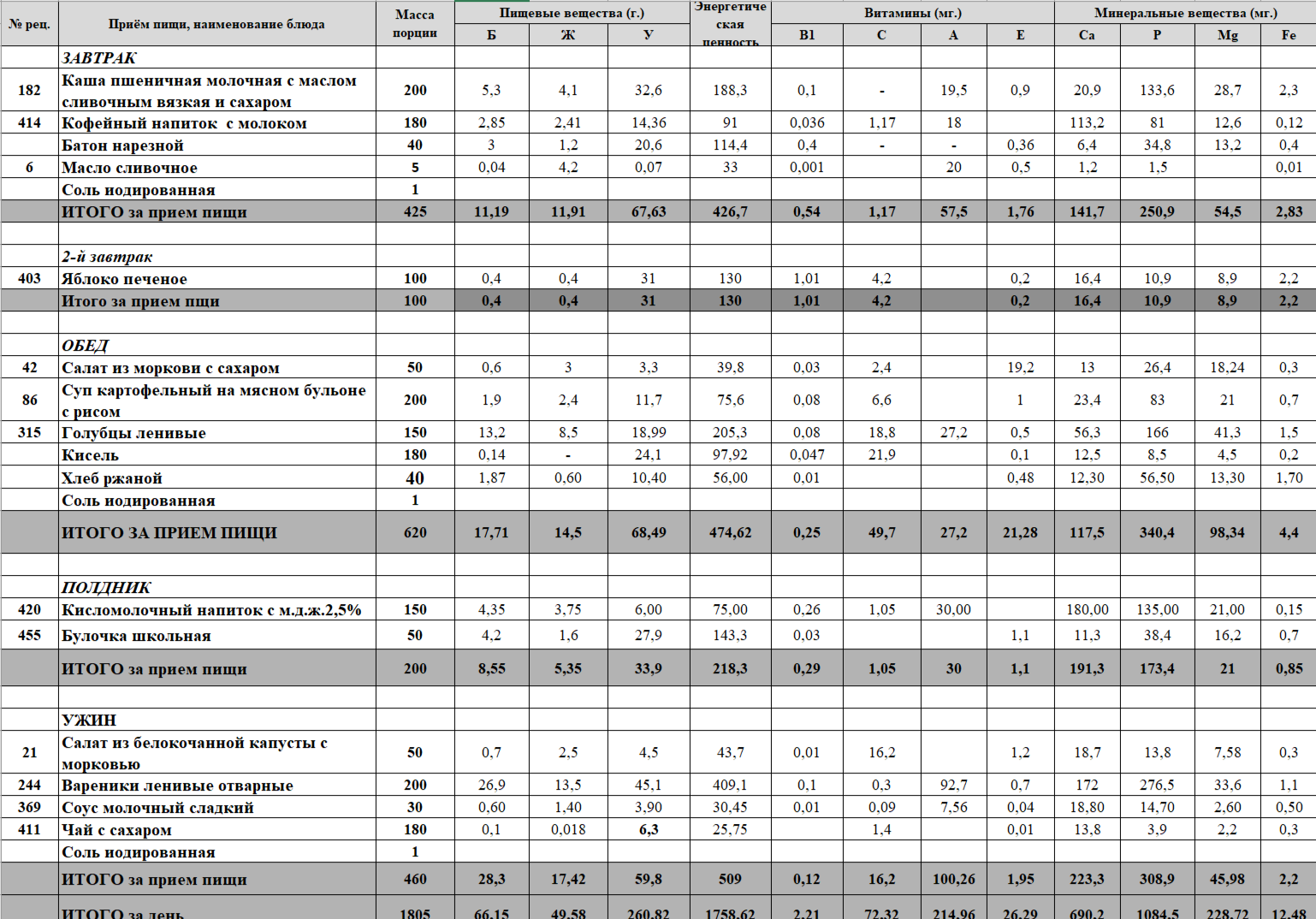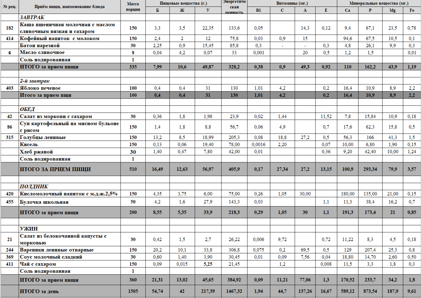 Меню ежедневного горячего питания